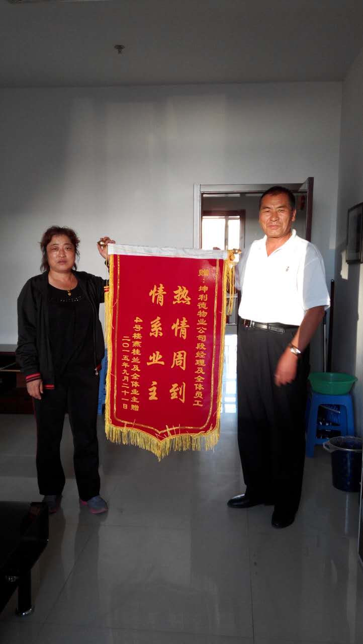 我公司于九月十二日启动了本小区物业服务全面工作,在短短的十天时间里,清扫外围环境卫生,清运长期积存垃圾,疏通陈堵已久的5#楼地下室污水管道,抢修泵房外地下自来水管道破裂,得到小区全体业主的好评与认可,赢得4#楼全体业主馈赠锦旗一面。我公司深感服务于小区全体业主的荣幸,也深感全体业主对我公司的有力支持,更深感是业主对全体员工劳动成果的肯定,我公司将秉承“业主至上,服务第一”的理念,兢兢业业做管理,踏踏实实做服务,点点滴滴做到位,以业主满意为责任,一如既往、持之以恒服务好小区全体业主。